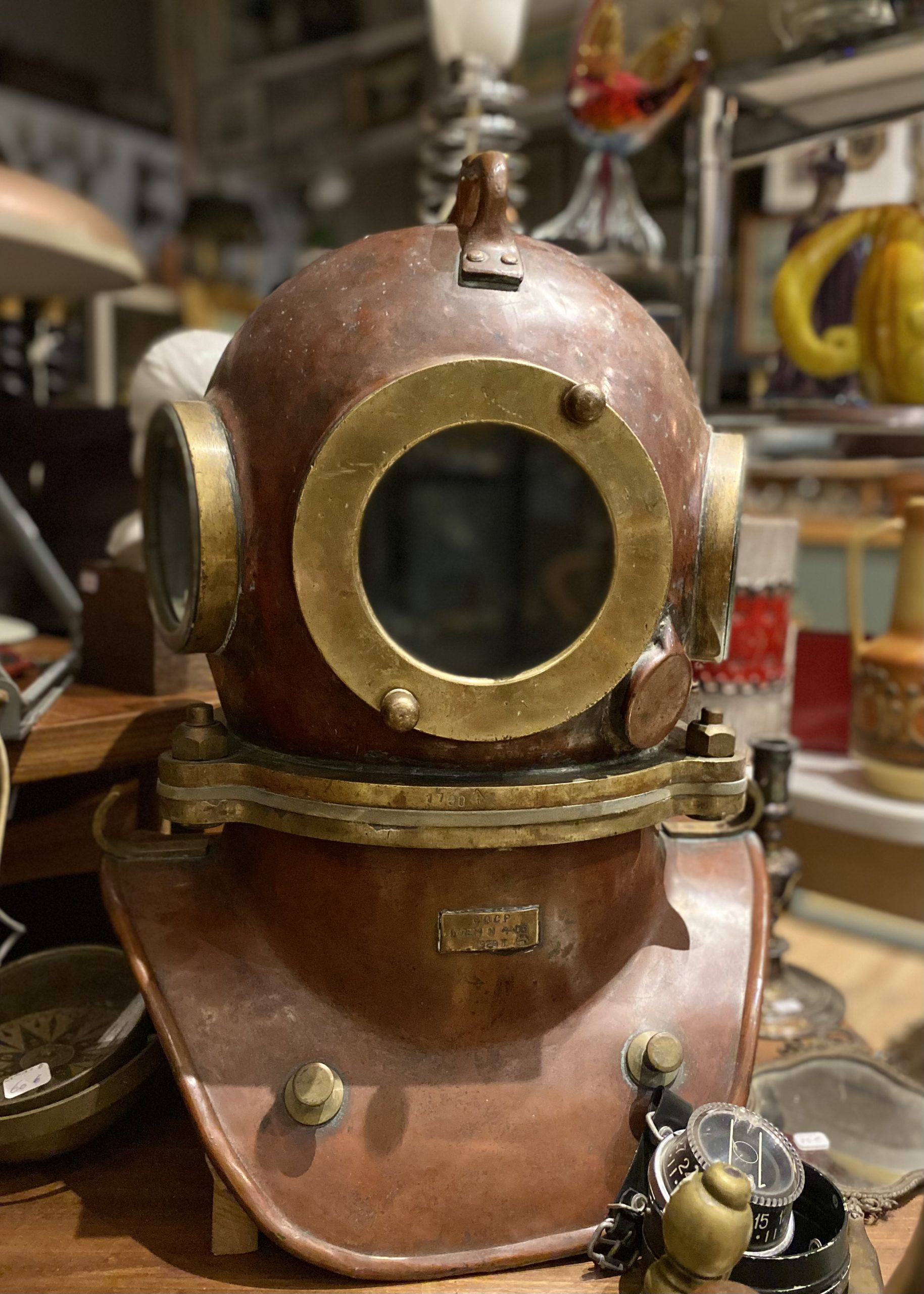 À la croisée de l’objet technique, de l’histoire militaire et du design industriel, ce casque russe constitue une pièce de collection recherchée. Il trouve naturellement sa place dans un univers maritime, un cabinet de curiosités ou un intérieur contemporain où il devient un élément décoratif spectaculaire.