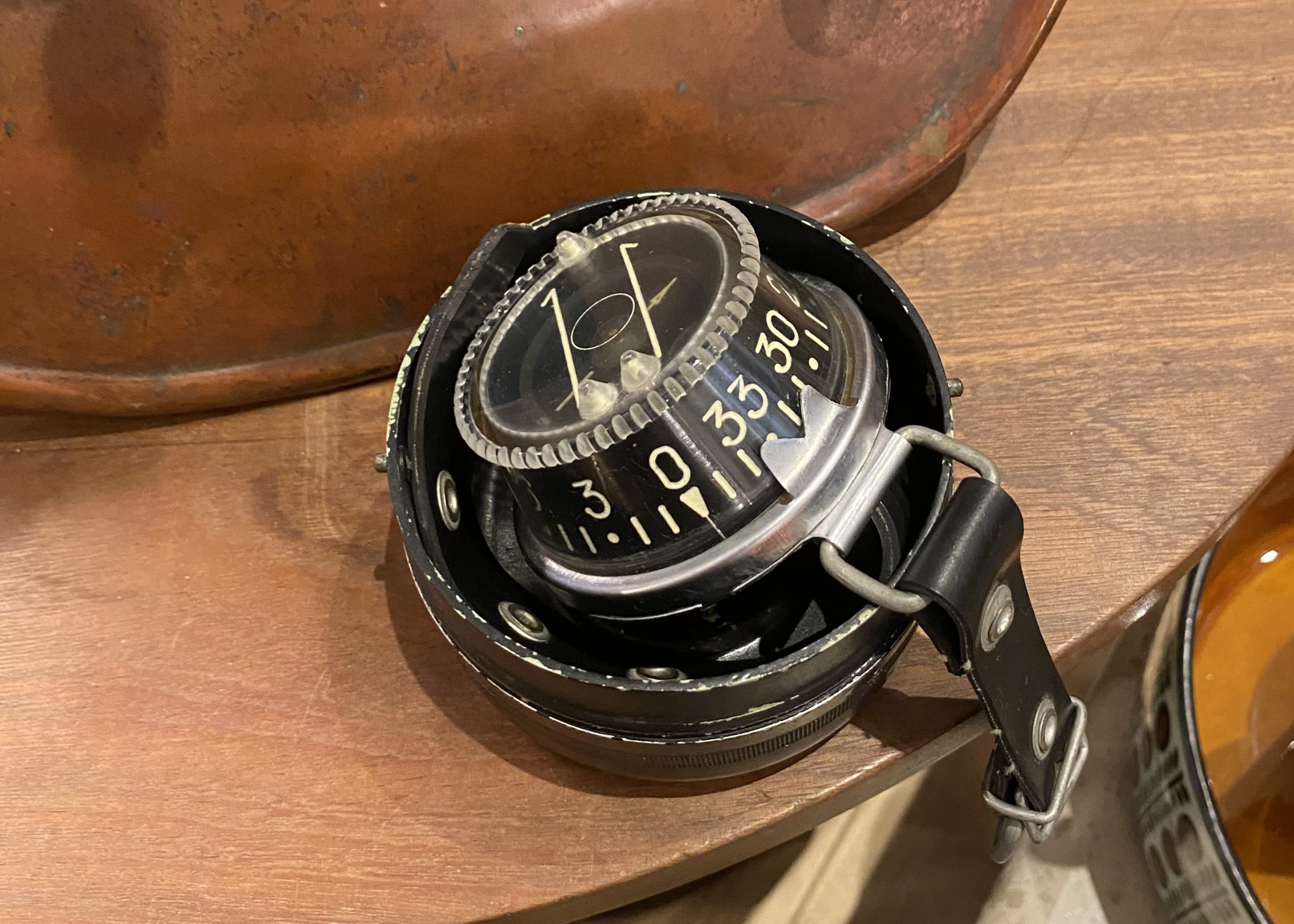 La patine du métal, aux nuances chaudes et profondes, renforce son authenticité et met en valeur le contraste entre le cuivre rougeoyant et les éléments en laiton doré. Les marques du temps participent à son caractère et rappellent son usage opérationnel.