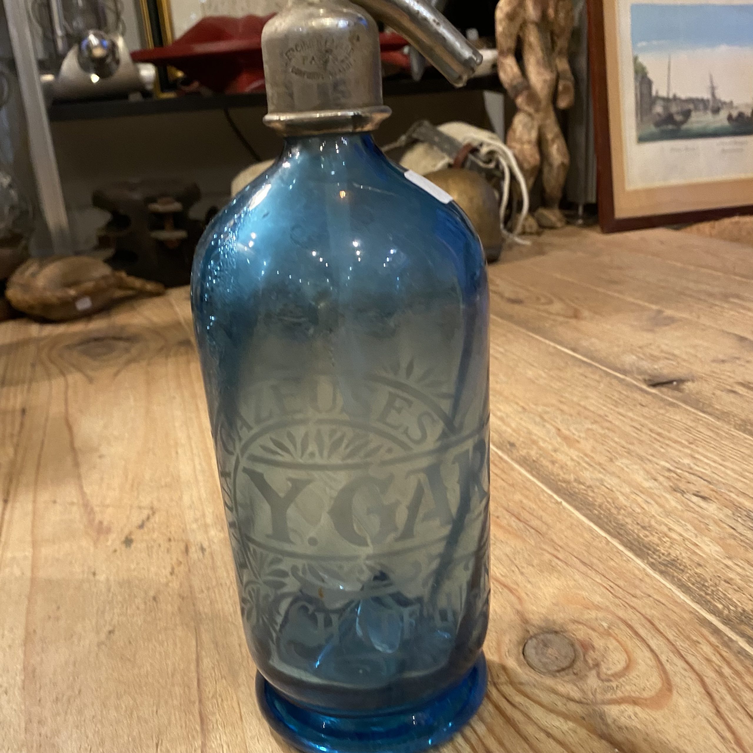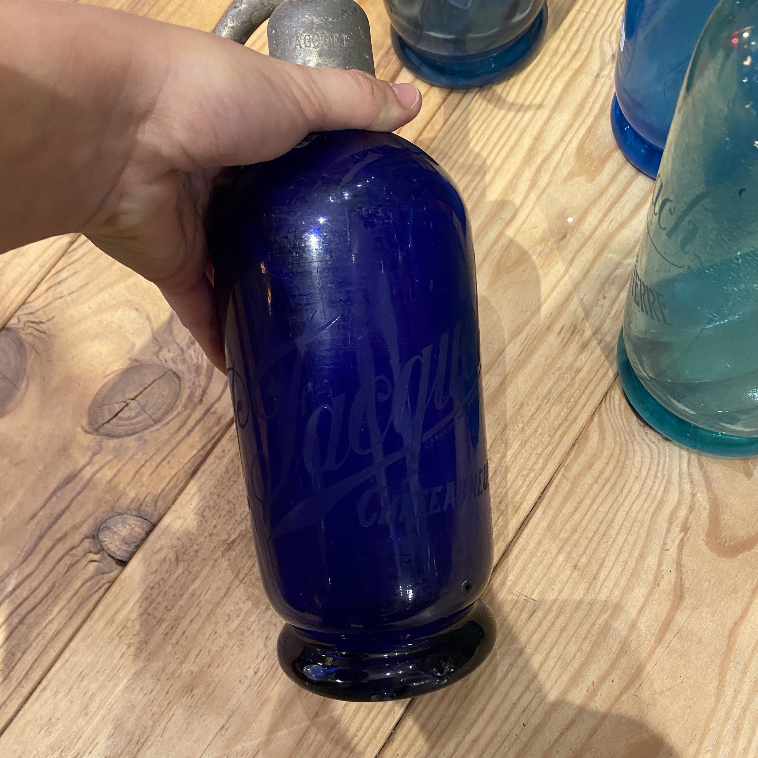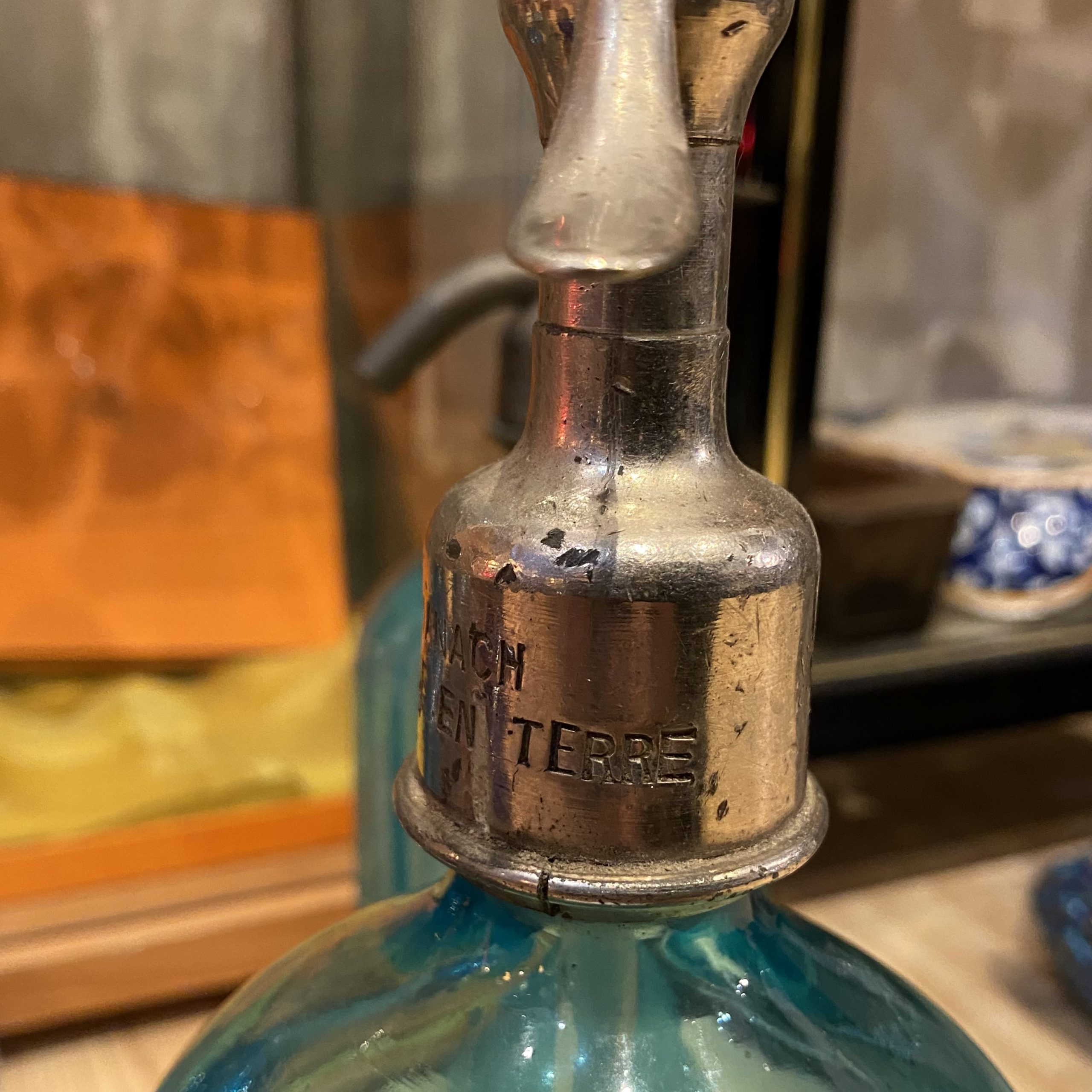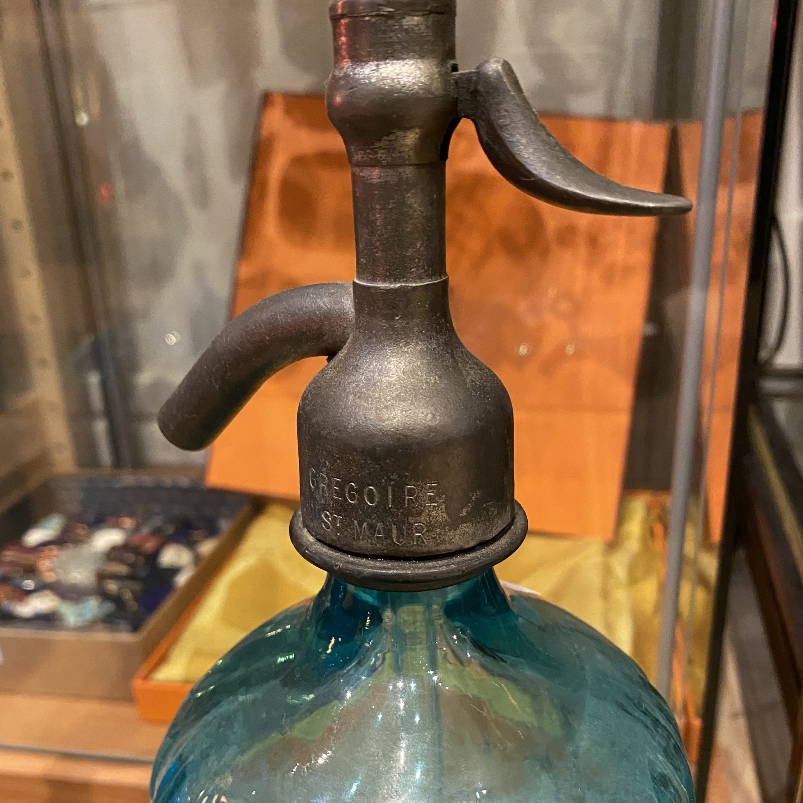 Réalisés en verre épais coloré, ces modèles se distinguent par la richesse de leurs teintes, allant du bleu profond au turquoise lumineux. Ces couleurs, caractéristiques des siphons anciens, avaient une fonction autant pratique qu’esthétique : protéger le contenu de la lumière tout en apportant une présence visuelle forte sur les comptoirs de cafés et les tables de bistrot.