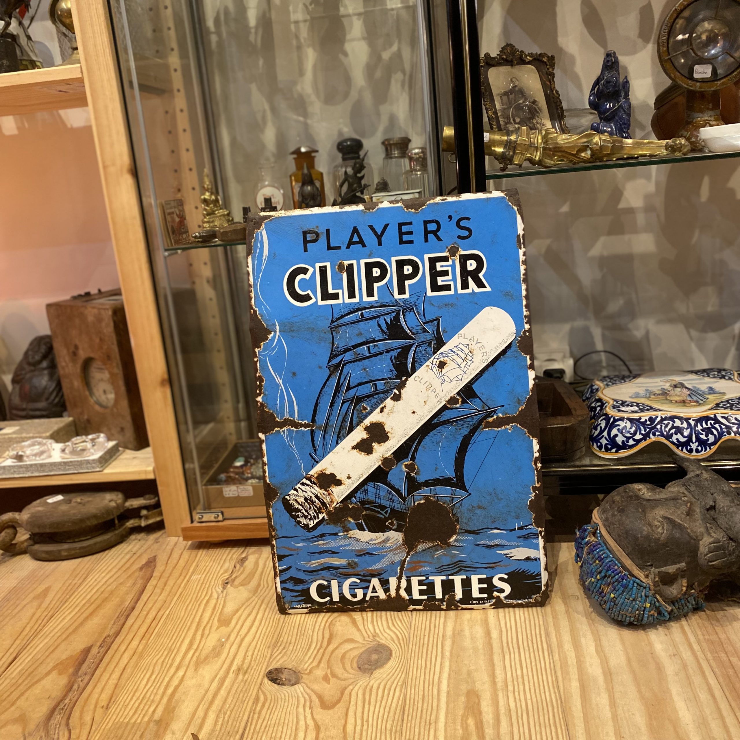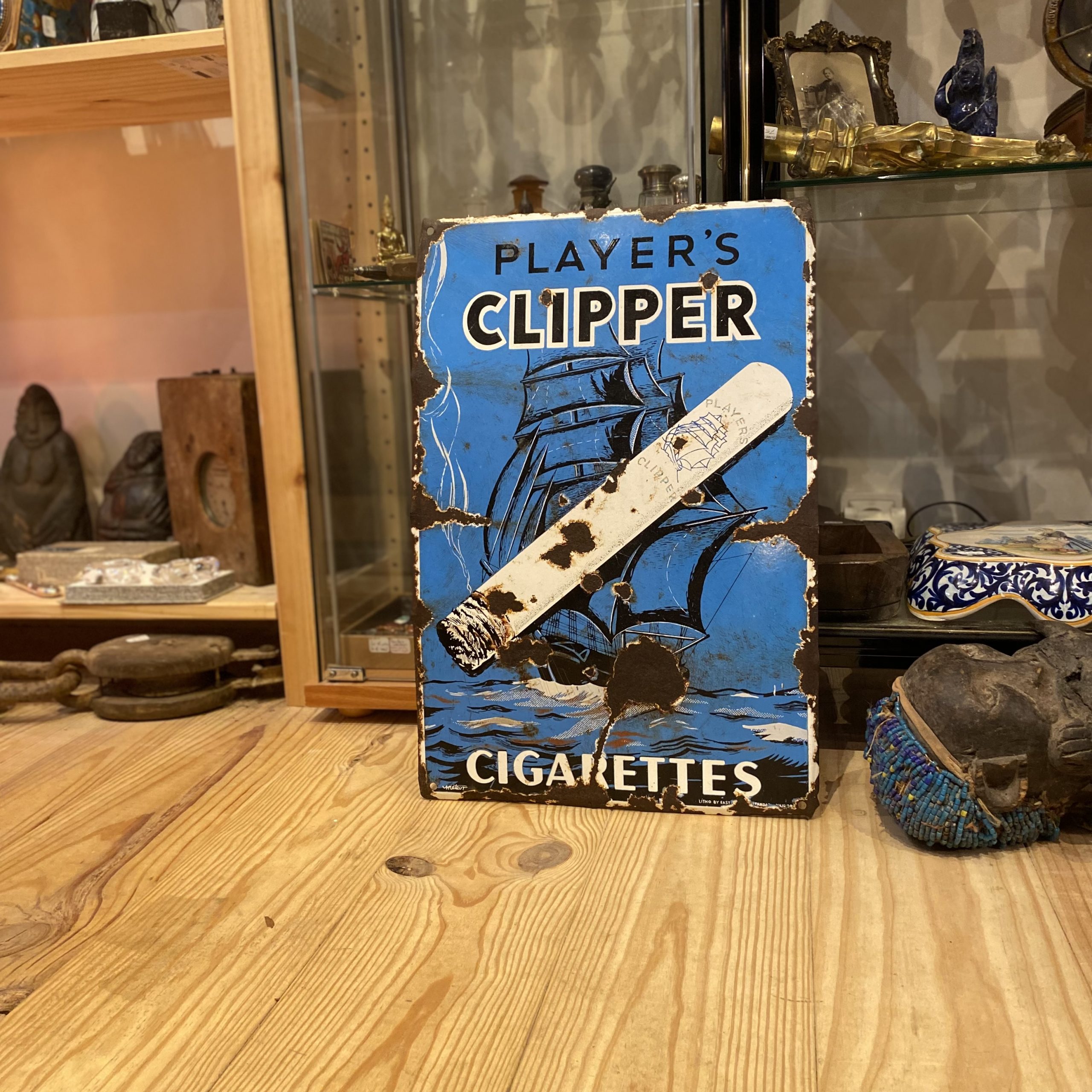 Témoin emblématique de l’âge d’or de la publicité industrielle, cette plaque émaillée “Player’s Clipper Cigarettes” évoque une époque où l’image et l’objet se mettaient au service d’une communication à la fois esthétique et durable. Destinée à être affichée dans les débits de tabac, cafés ou lieux publics, elle participait à la construction d’un imaginaire visuel fort autour des grandes marques de cigarettes du début du XXᵉ siècle.