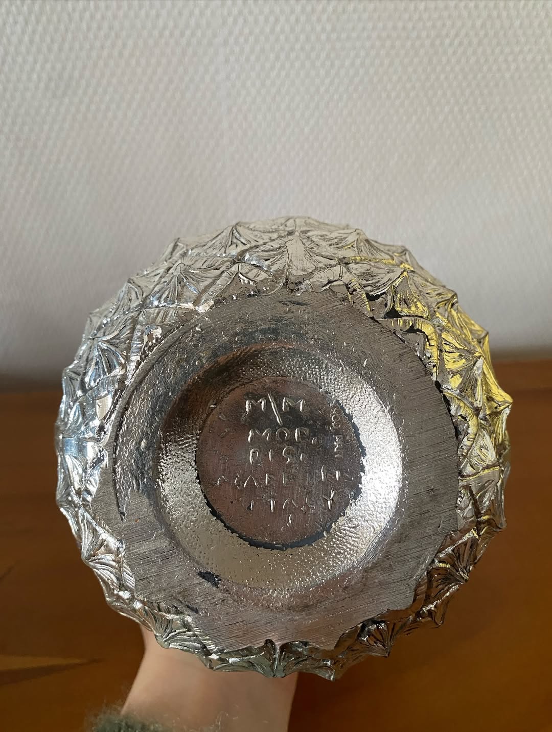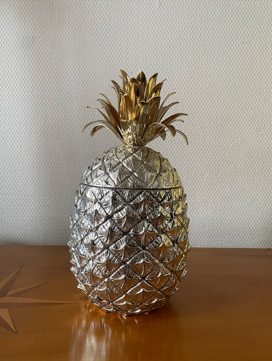 Entièrement réalisé en métal argenté, ce seau présente un remarquable travail de relief et de texture, évoquant fidèlement la peau de l’ananas. Son couvercle sculptural, surmonté d’un feuillage doré, apporte un contraste élégant et renforce son caractère luxueux et décoratif.